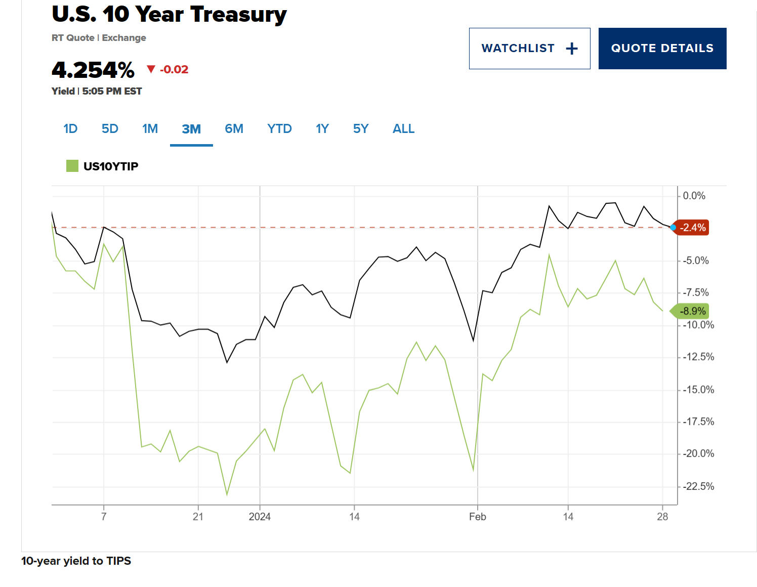 The net result of today’s numbers increased the yields on the 10-year treasury by nearly ¼ percentage, while the 10-year tips rate increased by more than ¼ point.