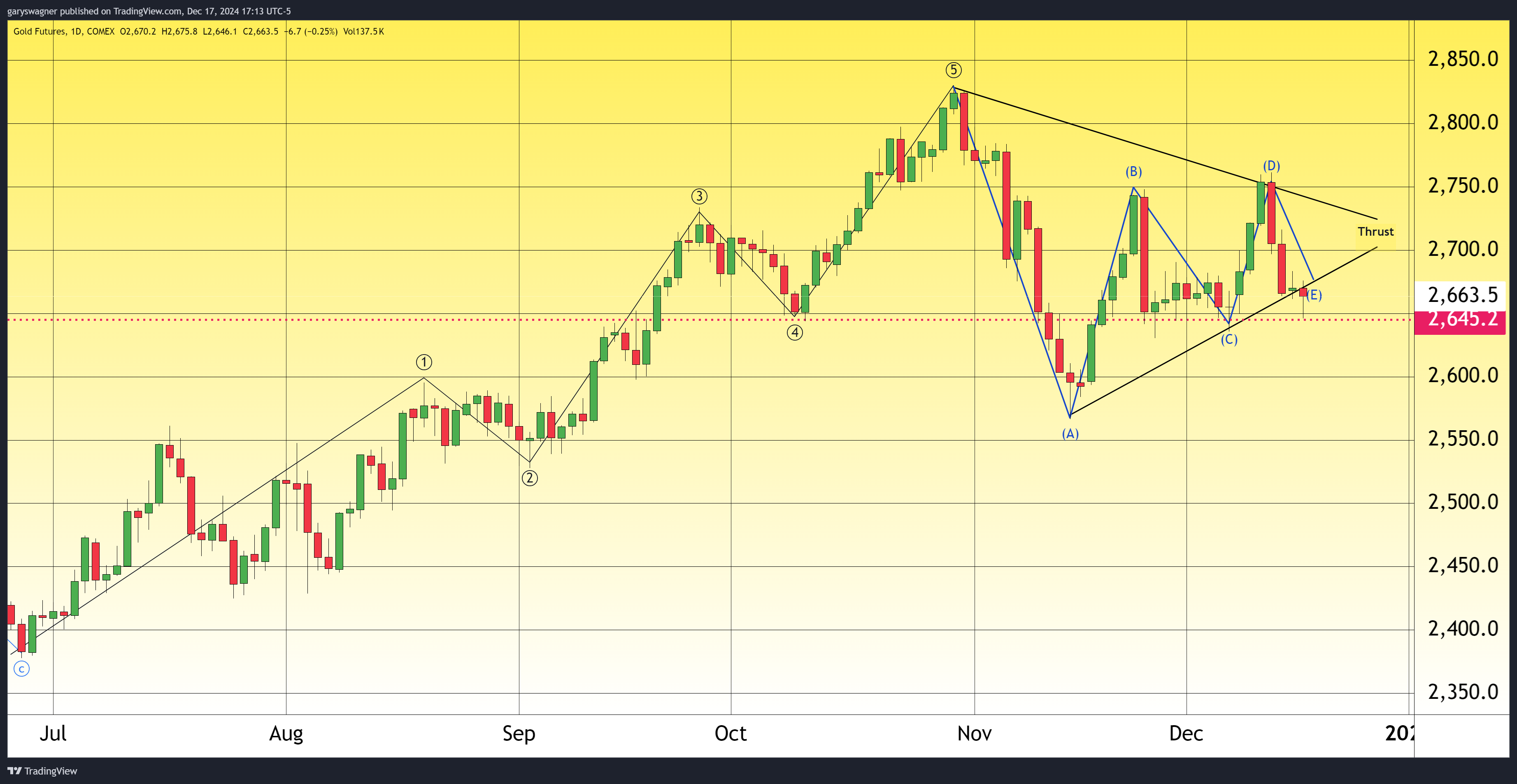 The daily Japanese candlestick chart for February gold futures reveals a pronounced correction following the all-time high of over $2,800 per ounce on October 30. After reaching a low of $2,566 on November 14, the market has been characterized by a series of lower highs and higher lows. Today's trading marked a significant technical development, with gold futures breaking below the lower-level support trendline and opening and closing beneath the previous support line of a compression triangle pattern.
