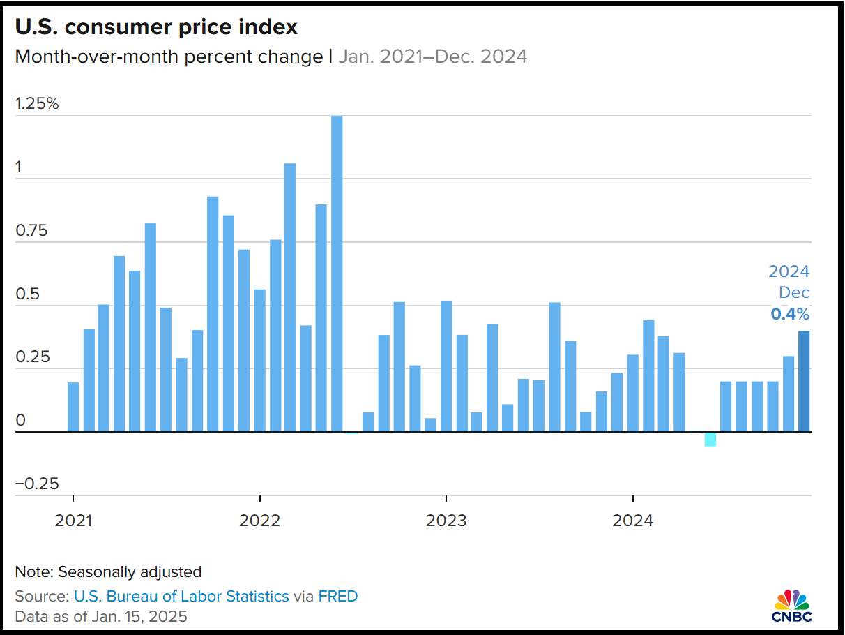 The U.S. Bureau of Labor Statistics reported that inflation rose 0.4% in December, exceeding both November's 0.3% increase and analysts' consensus estimate of 0.3%. The annual inflation rate stood at 2.9% before seasonal adjustments. Core CPI, which excludes volatile food and energy prices, showed a 3.2% annual increase, slightly below the expected 3.3%.