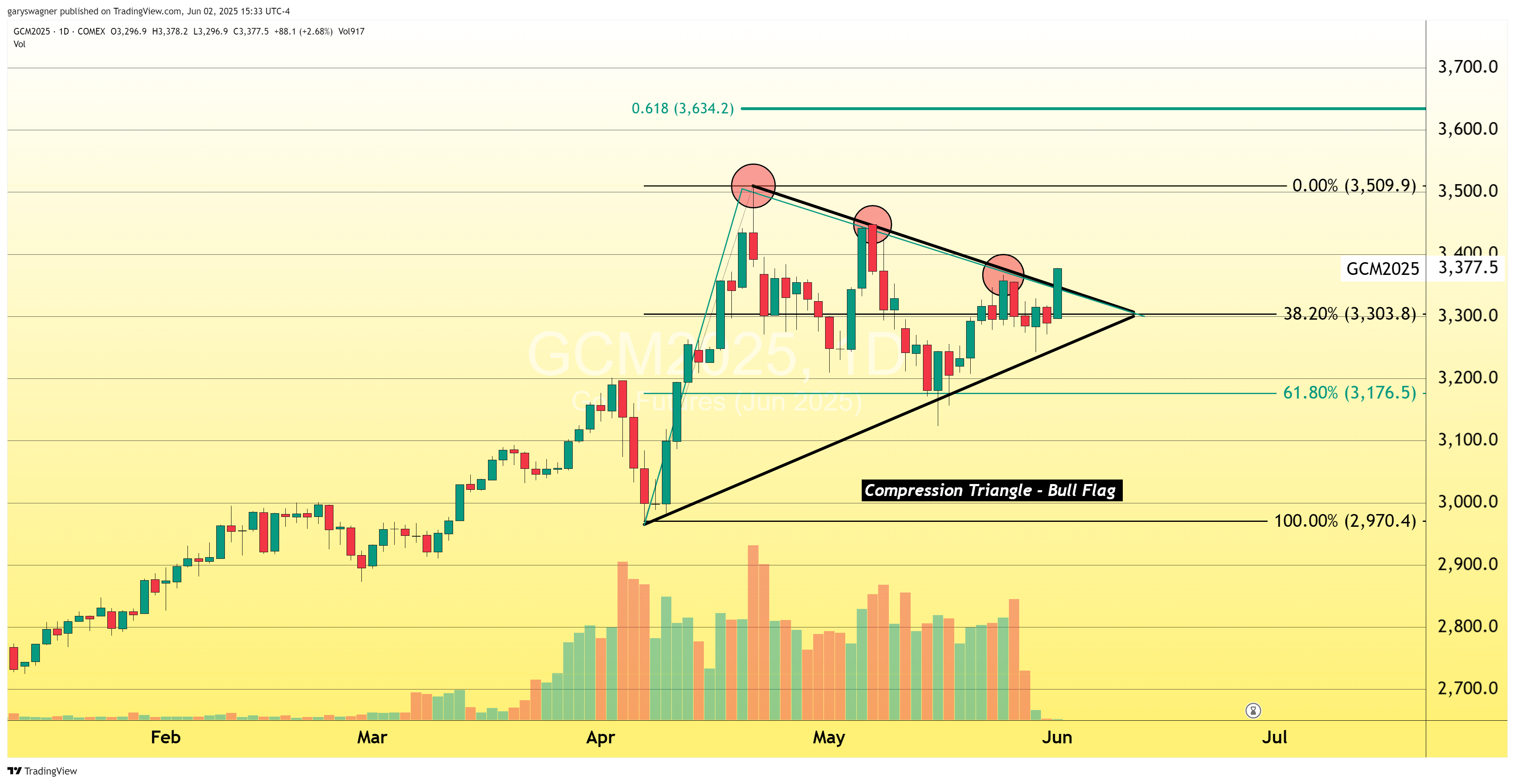 From a technical perspective, today's rally represents a significant breakout above recent resistance levels. Gold had established a pattern of declining peaks since reaching an intraday record high of $3,509 on April 22. Subsequent lower highs occurred on May 6-7 at approximately $3,447 and again on May 23 near $3,358, forming a compression triangle pattern over the past two months.