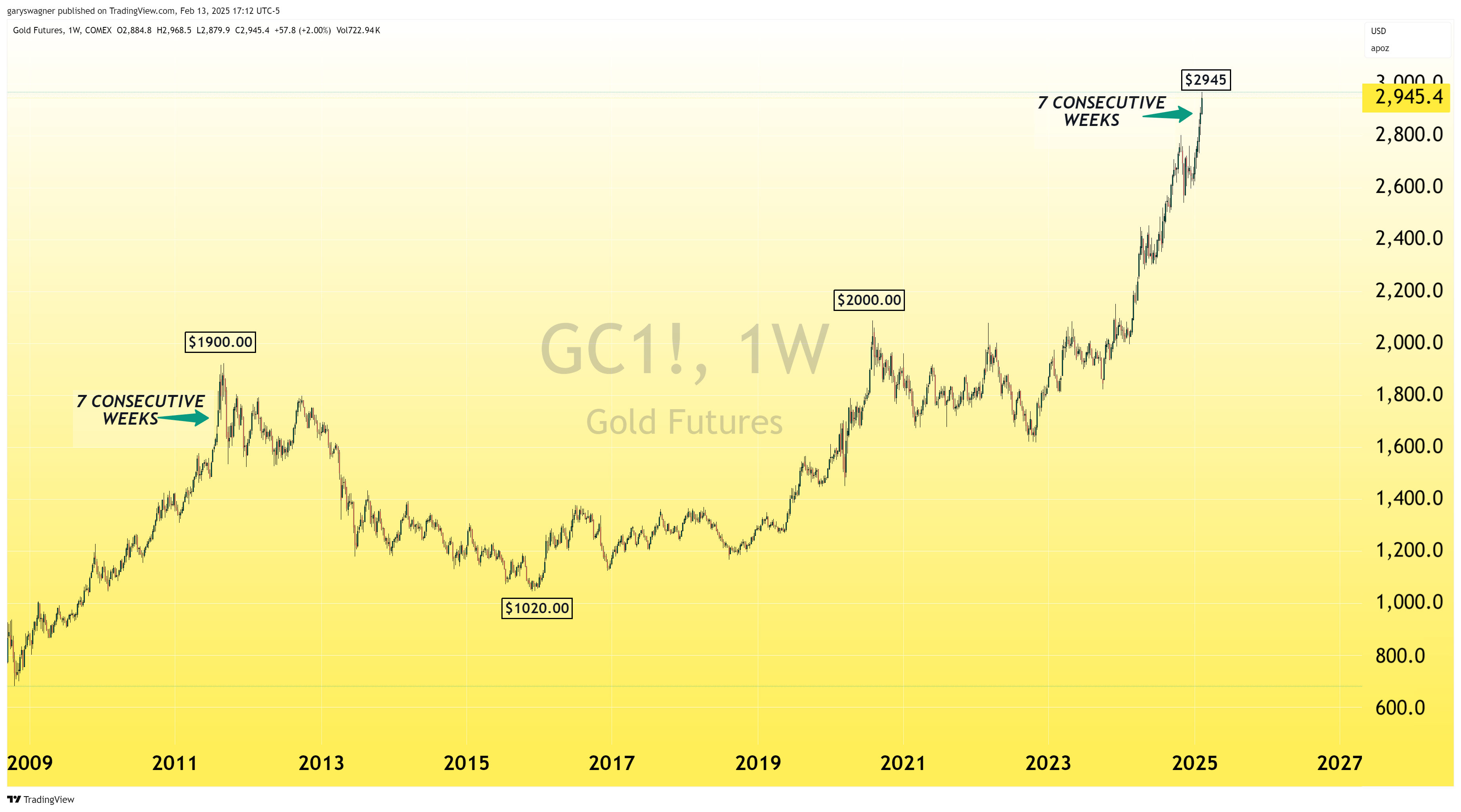 A remarkable technical pattern has emerged in gold's price action: seven consecutive weekly gains, represented by bullish (green) candlesticks beginning December 30. This rare occurrence has only one historical precedent in recent gold trading history, observed during the summer of 2011.