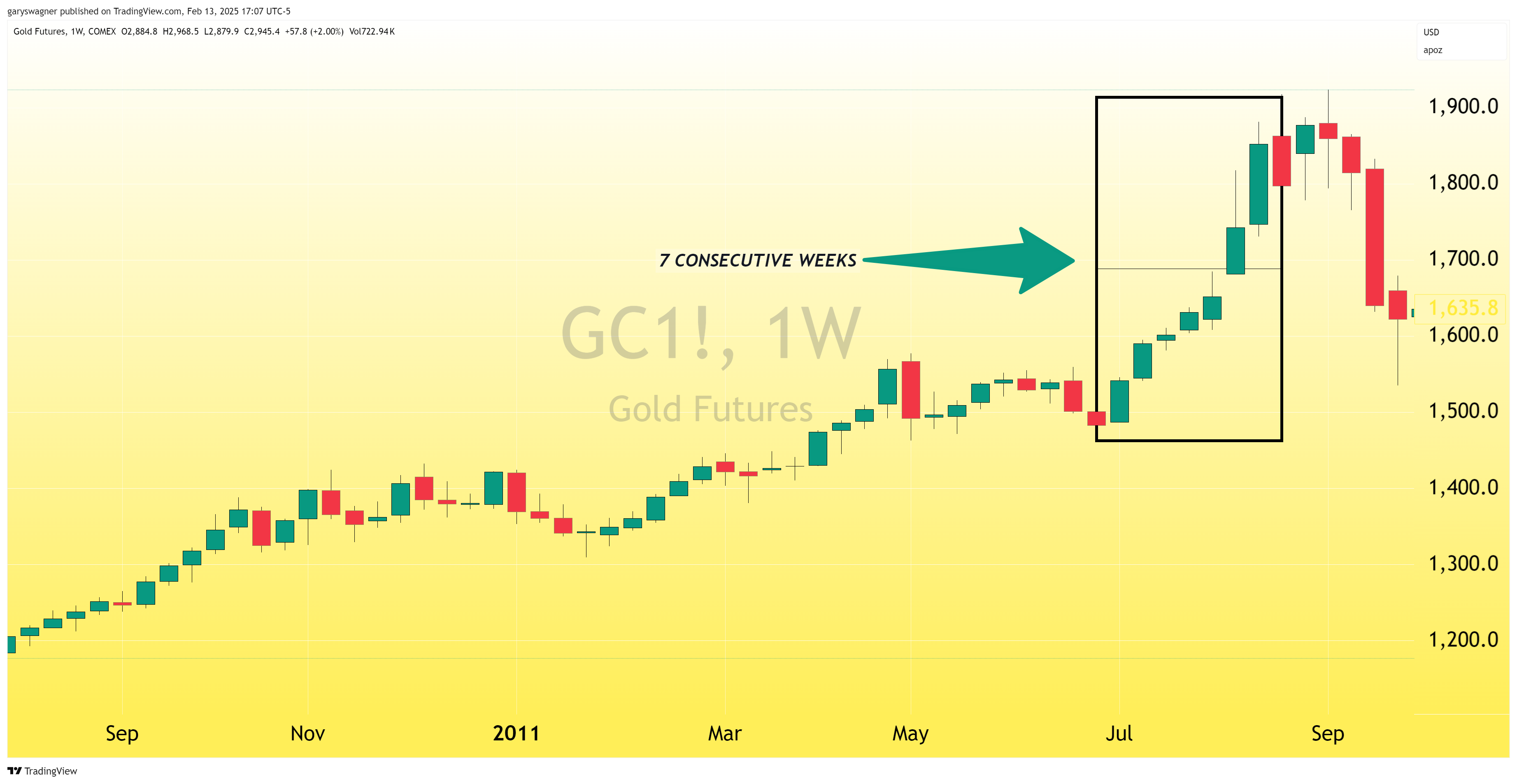 The chart above highlights the first occurrence of seven consecutive large green weekly candlesticks in gold. In seven consecutive weeks beginning on Monday, August 15, 2011. Over the next seven consecutive weeks gold would gain $395. Three weeks later in September 2011, gold would trade to an intraday high of $1923.70, creating a new record high above $1900 for the first time in history.