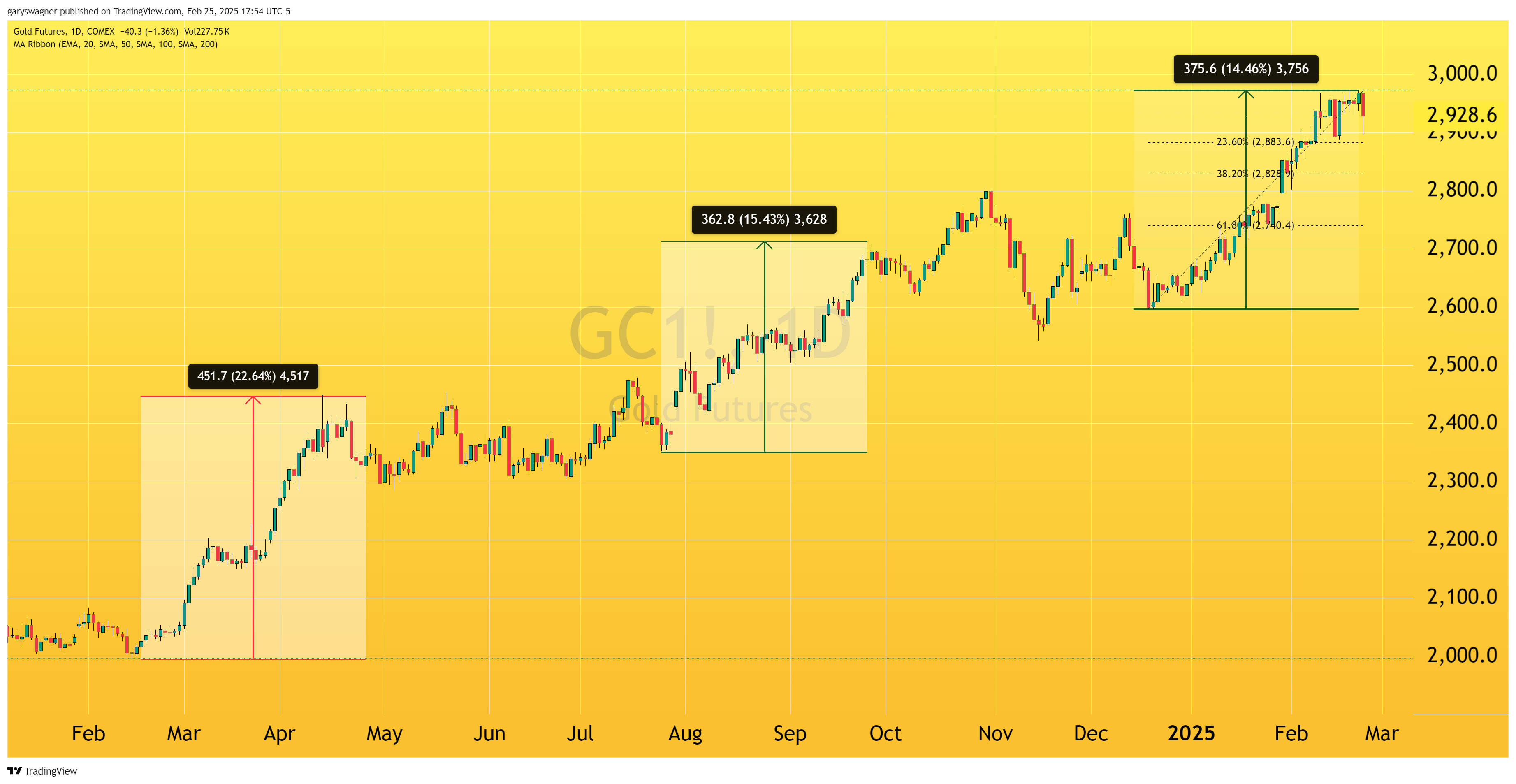 This recent rally follows two significant price advances in 2023. From mid-February, gold climbed from just below $2,000 per ounce to $2,448.80, yielding a $451 gain. Later, between late July and September's end, prices rose by $362, moving from $2,351 to $2,708.